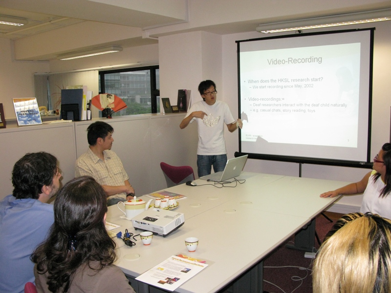Prof. Paul Dudis, assistant professor in the linguistics department and the co-strand director of Language Structure and Visual Modality (LSVM) at Gallaudet University, visited our centre in June 2008. He shared his views on the role of Deaf researchers in the development of sign linguistics with both our hearing and Deaf colleagues. He also presented a talk about his recent research in American Sign Language. Our team introduced our Child HKSL Corpus to him.